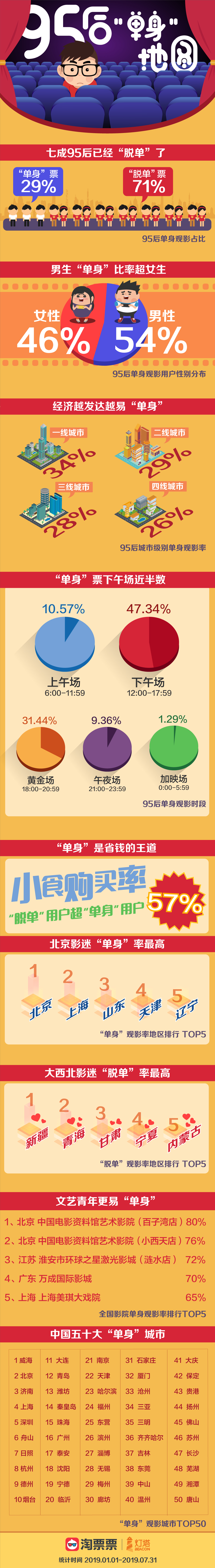 见圳客户端·深圳新闻网2019年8月7日讯(见圳客户端、深圳新闻网记者 陈婕)七成95后已经“脱单”了、经济越发达地区“单身”率越高,北京、上海、山东成最“单身”地区……七夕来临之际,用户观影决策平台淘票票和灯塔专业版联合发布了针对观影人群的《95后“单身”地图》,以“单身”观影的维度,去侧面观察时下年轻人的情感状态。