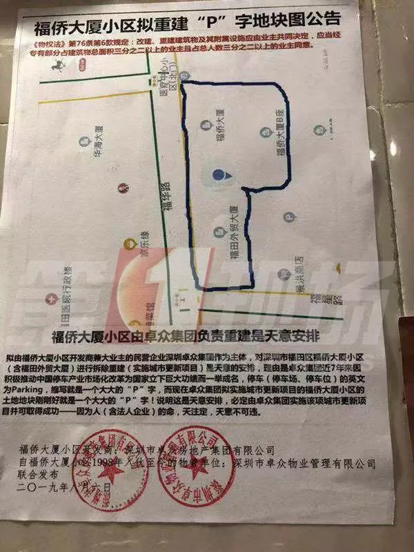 在福侨大厦小区公告栏里,出现了一张小区拟重建“p”字地块图的公告,落款为深圳市卓众房地产集团有限公司,拟重建的地块包括福侨大厦A、B座和福田外贸大厦,文中写道,福侨大厦由卓众房地产集团负责重建是天意安排。