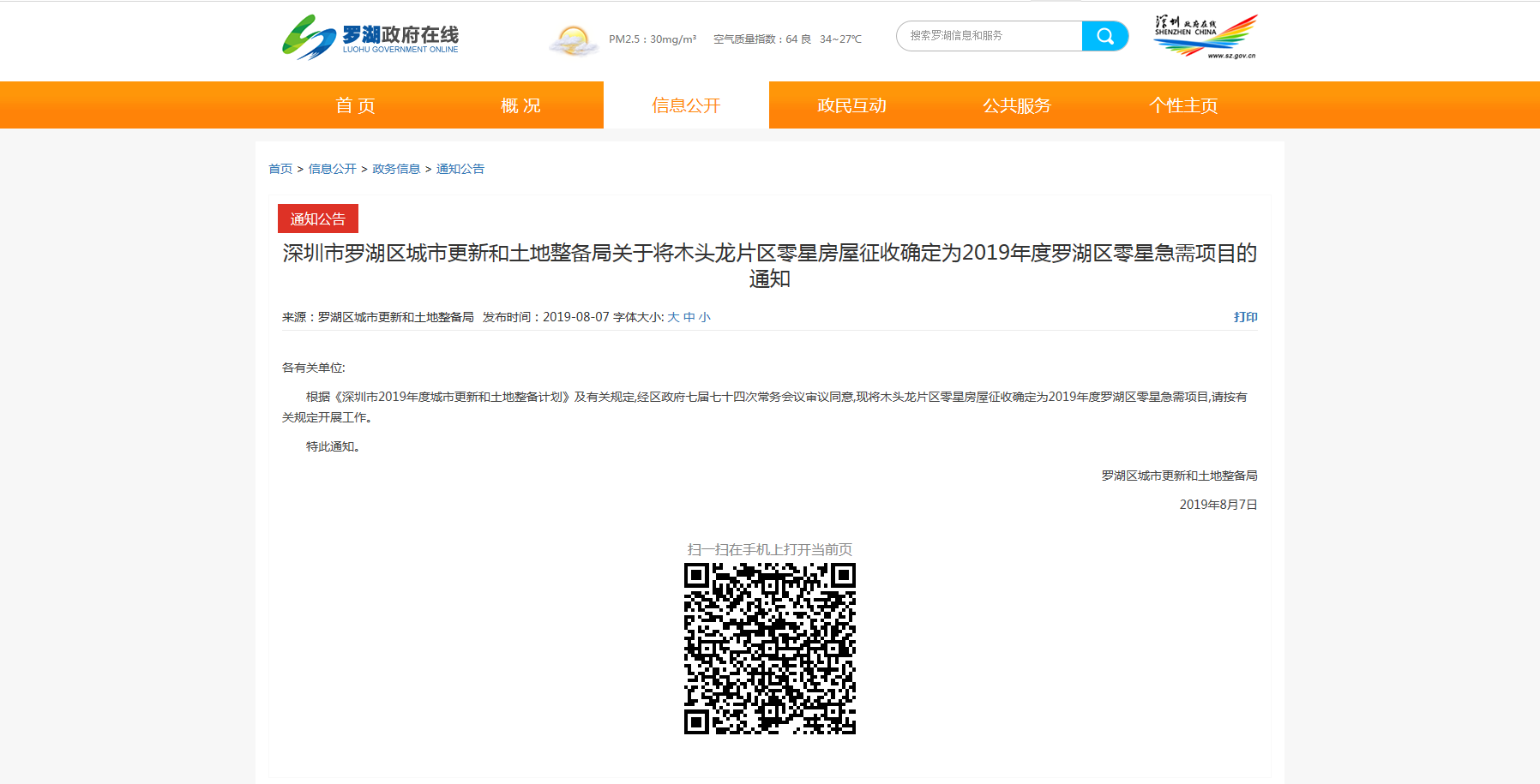因为多年来未进入实施阶段,积累了重大的社会风险,木头龙项目早不是单一的城市更新项目,已经演变成为一个复杂的社会问题。如今,事件迎来了新的转机。8月8日上午,罗湖区城市更新和土地整备局发布《深圳市罗湖区翠竹街道木头龙片区零星房屋征收提示》,木头龙片区零星房屋征收已确定为2019年度罗湖区零星急需项目,项目征收范围已确定。