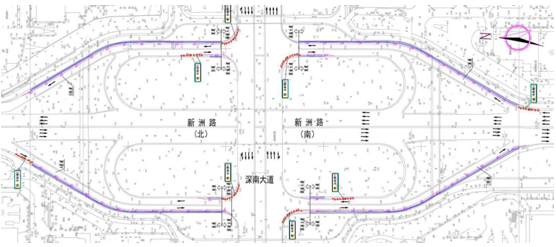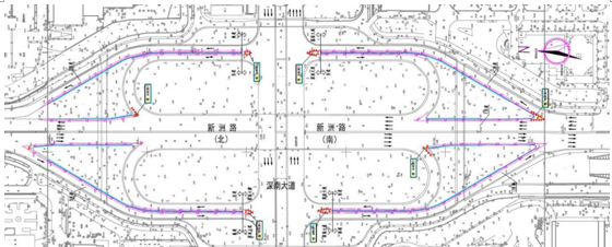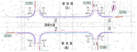 深南新洲立交新型防撞墙整治提升工作主要包括:一是对立交及匝道的旧防撞墙进行拆除并安装新型预制防撞墙;二是对立交及周边部分现状沥青路面病害进行维修翻新重新罩面;三是拆除桥梁段栏杆同时新建装饰铝扣板;四是对立交护栏进行刷新提升。
