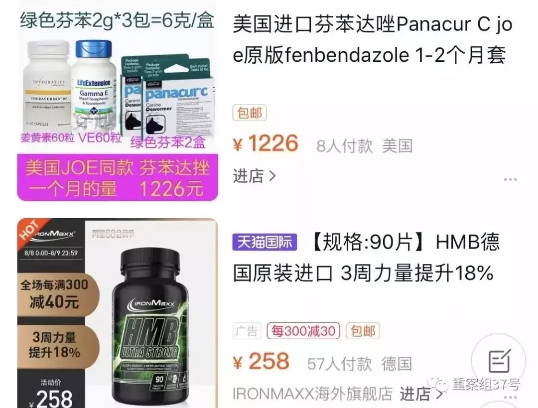 事情发展到现在,已经有人在网上做起这门生意。在电商平台搜索可见,不少商家打出“乔伊套餐”等招牌售卖芬苯达唑,自称是按美国患者乔的配方搭配,但如此一来,原本20多元一瓶的药,搭配后就要卖800元左右。