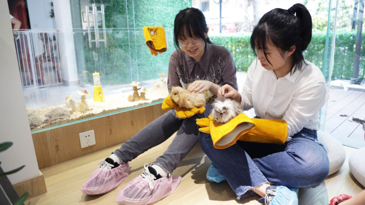 除了小动物和饲养员们,这里还聚集了许多年轻女孩儿,她们有的相互认识,轮流跟店里的小浣熊挠痒痒拍照;有的不认识彼此,却因为饲养过同样的小动物而熟络起来,相互传授养育自家"孩子"的经验。这只名为"六一"的小浣熊是这里的常驻小动物,面对市民们的热情,"六一"毫不客气地躺在小姐姐的臂弯里撒娇,引来其他市民们争相拍照。