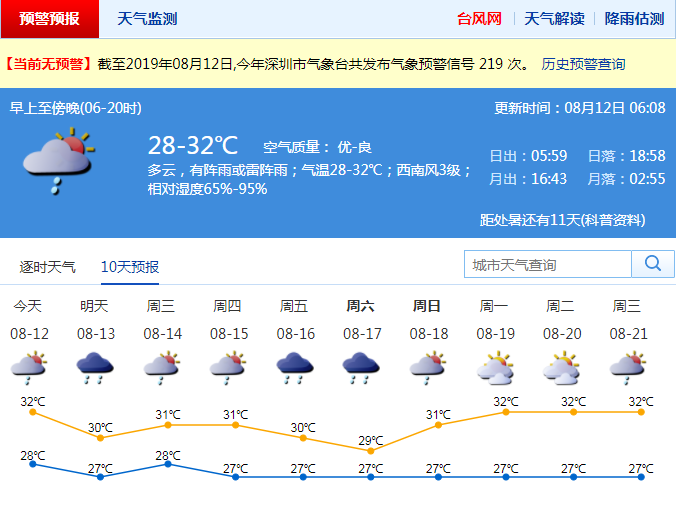 见圳客户端·深圳新闻网2019年8月12日讯 最近深圳高温天气持续,有市民调侃"仿佛站在空调外机旁"。不过,本周起,深圳雷雨天气增多,局部可达暴雨,炎热天气将有所缓解。
