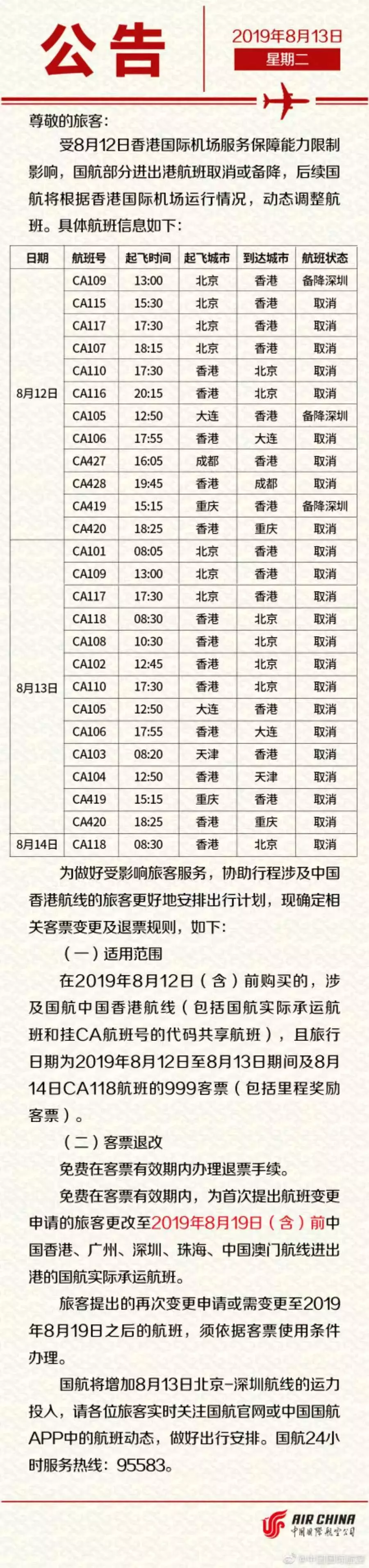 今晨,中国国际航空公司官方微博发布公告称,受8月12日香港国际机场服务保障能力限制影响,国航部分进出港航班取消或备降,后续国航将动态调整航班。