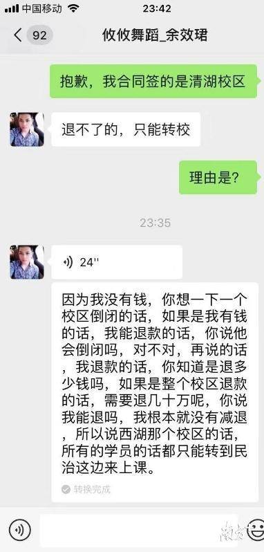 目前,学员们无法与余效珺保持稳定联系,但是8月7日与学员的沟通中,余效珺承认清湖校区需退的学费约有几十万,他无力退还,只能建议学员转到民治校区上课。