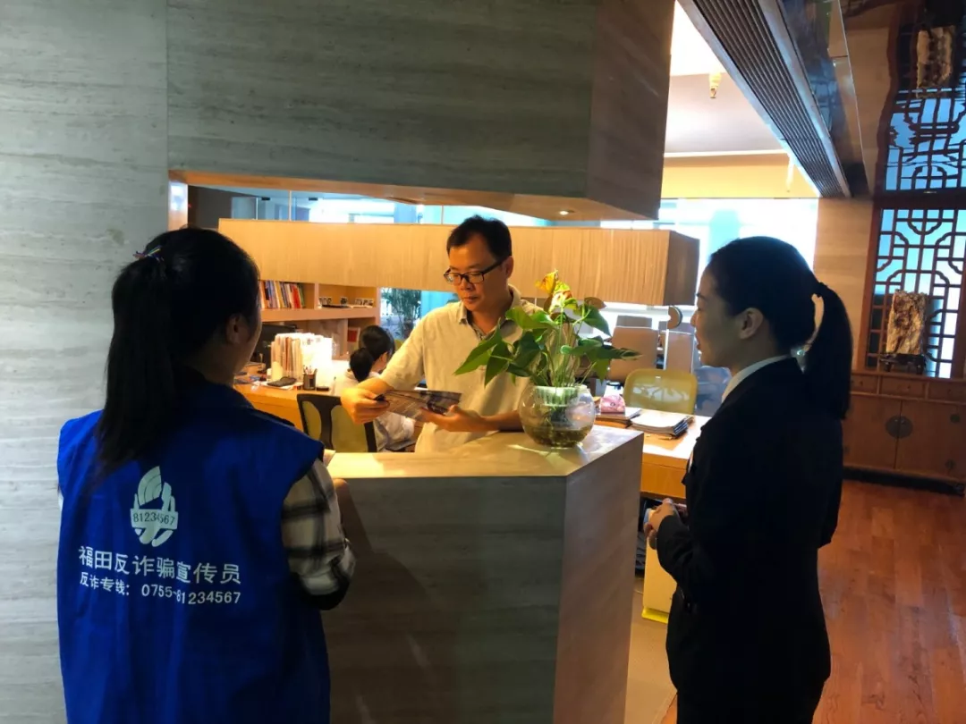 上午10时,深圳市公安局福田分局派出“蓝马甲”宣传队走入大中华国际交易广场,逐层逐户向企业员工们派发反诈骗宣传单及《福田反诈骗教育专刊》。“蓝马甲”宣传队员走进各企业办公室,向企业员工派发相关资料,讲解反诈骗知识。各企业员工积极参与,与“蓝马甲”讲师频频互动,并认真学习反诈骗技巧,努力提升自身反诈骗能力。