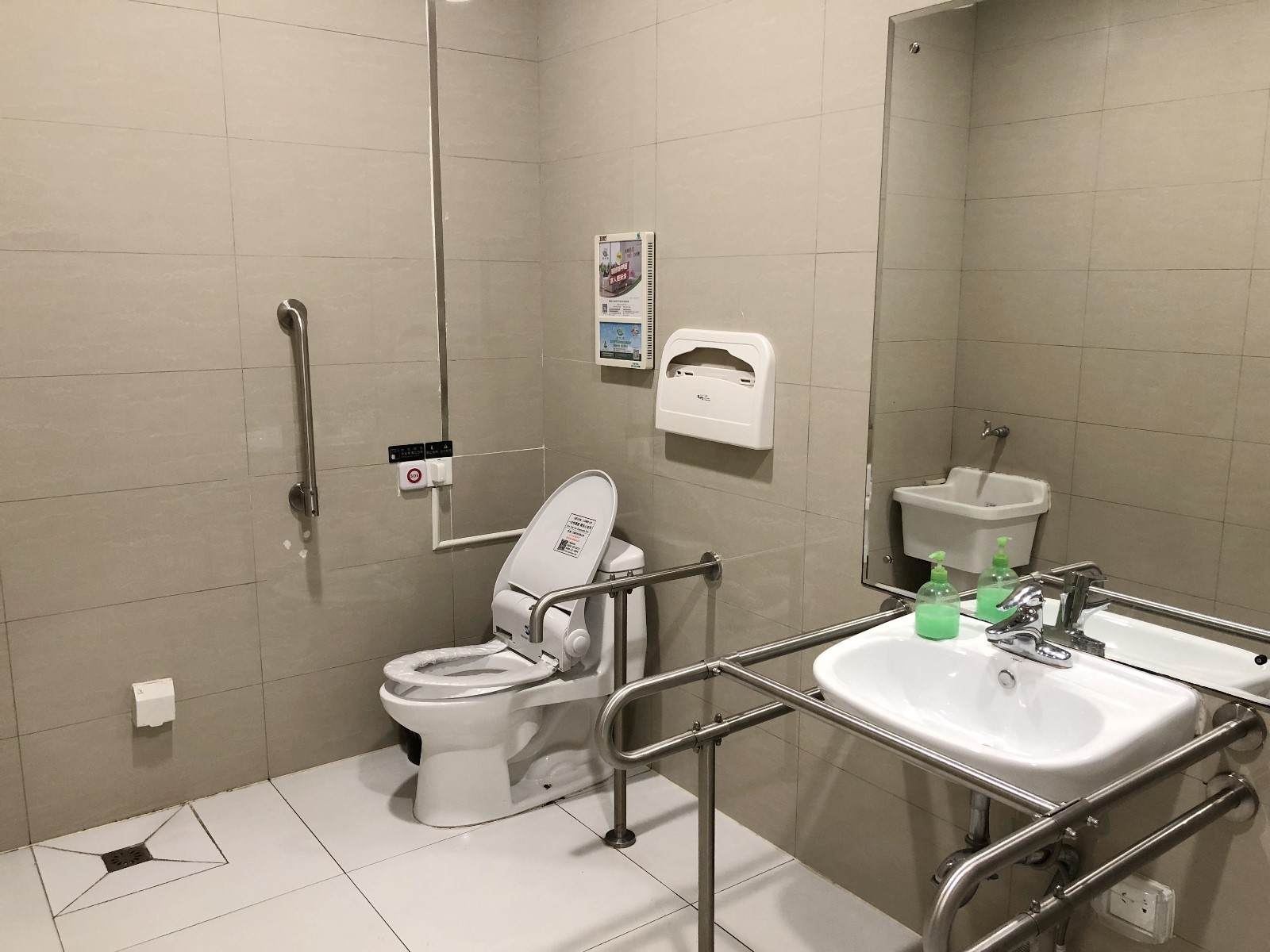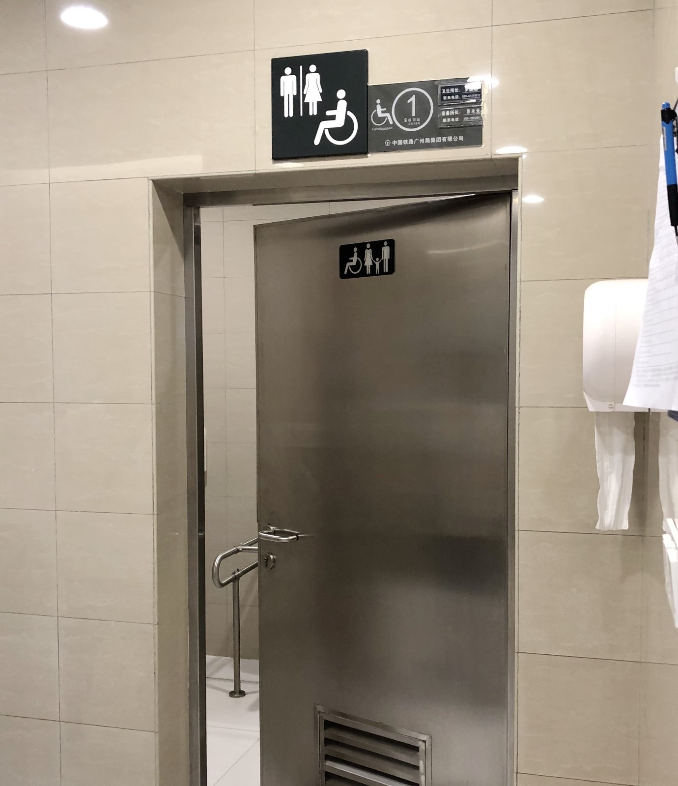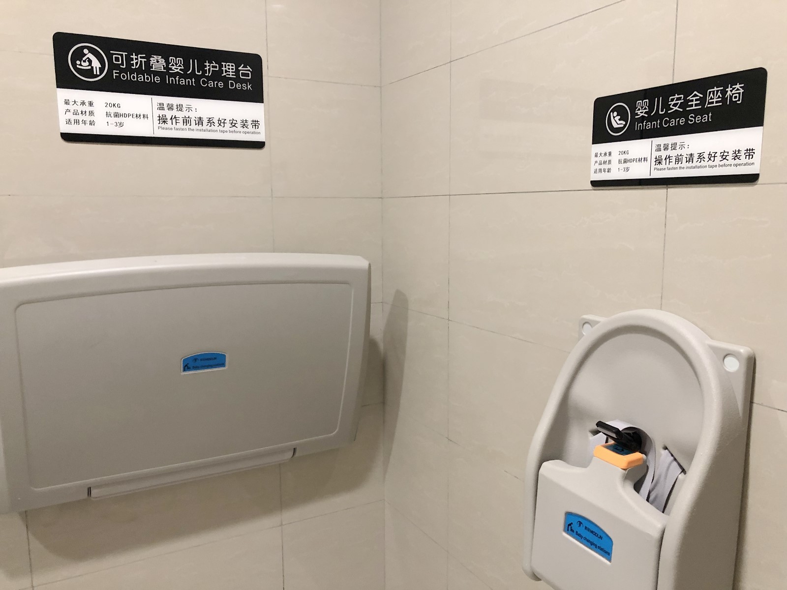 ▲在靠近福田高铁站方向的另一处洗手间,记者在残疾人洗手间的门上看到了第三卫生间图案标识。推门进入,里面除了设有带扶手、供残疾人使用的成人坐便器和洗手池之外,还有可折叠的婴儿护理台和婴儿安全座椅,这显然是一间将母婴室、残疾人洗手间“二合一”的洗手间,但没有第三方洗手间配置所要求的儿童坐便器。