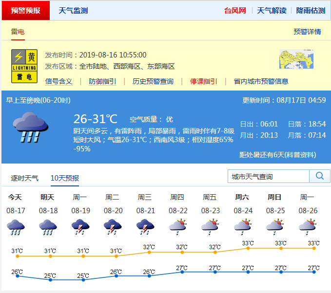 接下来,天气将发生转变,预计17日至19日有雷阵雨,局部可达暴雨量级,伴有雷暴和7~8级短时大风,高温天气将得到缓解,提醒市民做好防雷防雨防风措施。