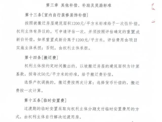 此外,室内自行装修装饰补偿标准,将按照被搬迁房屋建筑面积1200元 /平方米标准给予一次性补偿。搬迁费以被搬迁房屋的建筑面积为计算基数,按每次50元 /平方米的标准,给予搬迁费补偿。