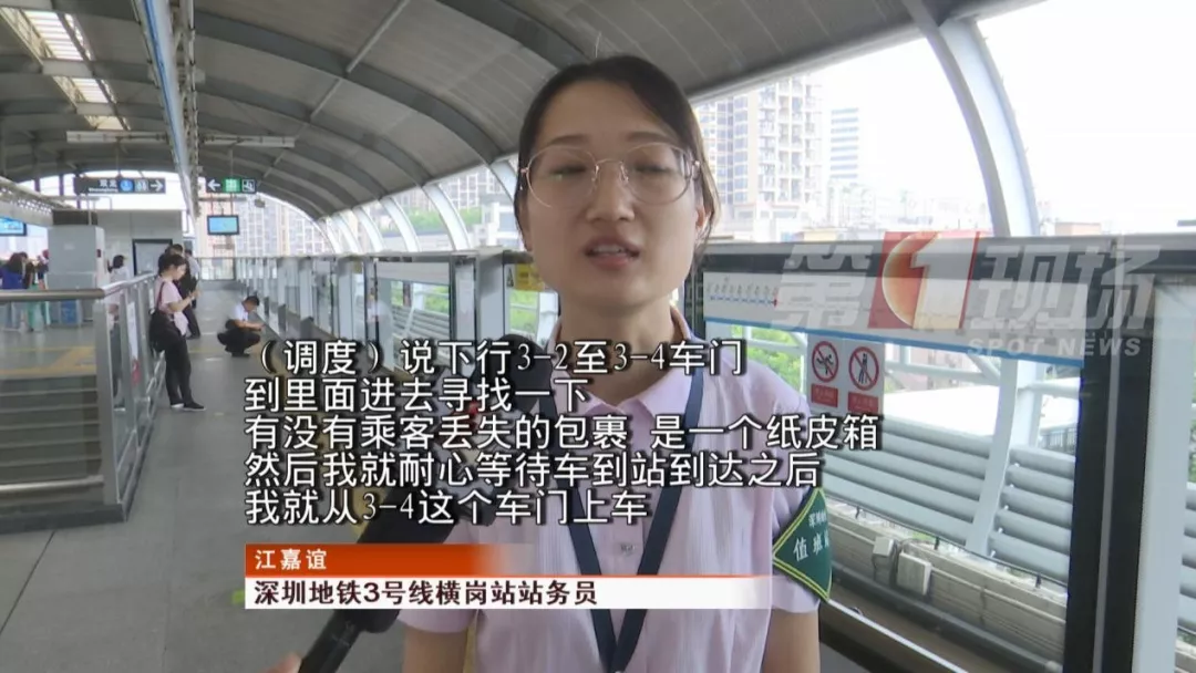 当时,一辆列车即将到达龙岗的横岗站,站务员从3-4号门上车寻找。最终,站务员在列车座位下面找到了乘客遗失的纸箱,并通知乘客前往横岗站。
