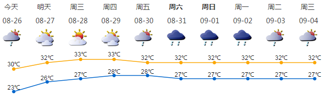 我市大雨转阵雨;气温23-30℃;西南风3级;相对湿度65%-95%。