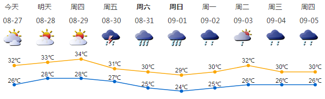 我市多云,局地有短时阵雨;气温26-32℃;偏南风2-3级;相对湿度65%-95%。