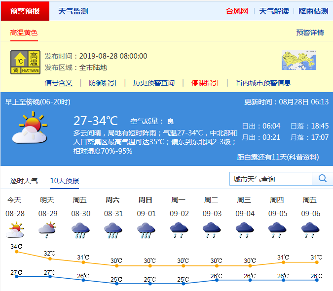 据市气象局预计,我市28-29日炎热加剧,午后局部有热雷雨,最高气温34-36℃;30日至9月1日有一次大雨局部暴雨降雨过程,最大阵风6-7级,闷热缓解。市气象局提醒市民,台风“杨柳”进入南海后,其路径强度预报尚有不确定性,请市民关注市气象台发布的最新预报预警信息。