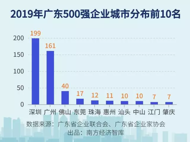 在这份榜单中,500家入选企业分布于广东19个城市。其中,超过九成来自珠三角城市,前10强企业来自广州、深圳、佛山三市,2018年营业收入超过1千亿的21家企业同样来自珠三角,其中深圳11家,广州6家,佛山2家,珠海和惠州各有1家。