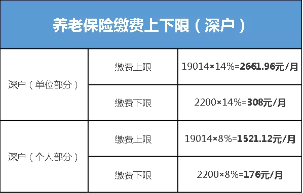 缴费基数:为职工上月工资总额,最高为上年度广东省全口径城镇单位就业人员月平均工资6338元的3倍,即19014元,最低为深圳市最低月工资标准2200元。