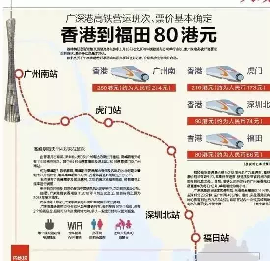 广深港高铁香港段,从香港西九龙总站发车,到深圳福田站、深圳北站、虎门站和广州南站票价基本确定为80港元、90港元、210港元和260港元。