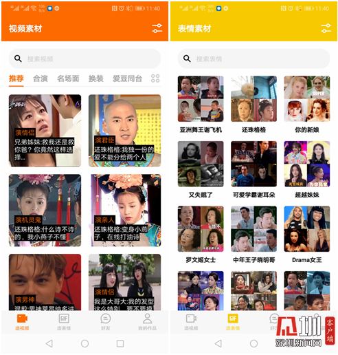ZAO提供的视频素材和表情素材页面截图。
