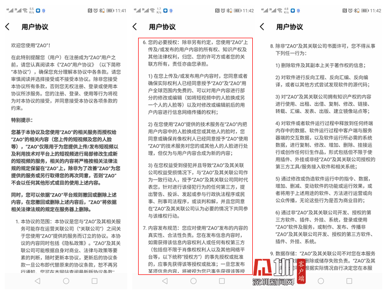 见圳客户端.深圳新闻网2019年9月3日讯(见圳客户端、深圳新闻网记者 张玲)从一夜爆红,到争议不断,AI换脸APP“ZAO”三天内体会到“过山车”般的口碑暴跌——由于其面部识别功能,及其《用户协议》(简称“协议”)引起了网络上的激烈讨论。有人担忧“ZAO”借此软件搜集用户面部识别信息向第三方销售牟取暴利。