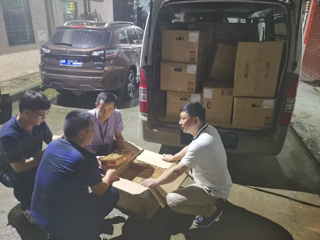 执法人员在嫌疑人住所外清点、扣押涉案的月饼