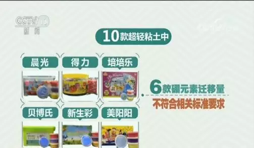 其中,10款超轻黏土中有6款硼元素迁移量被检出不符合相关标准要求;这六款样品分别是:标称晨光、得力、培培乐、贝博氏、新生彩和美阳阳牌超轻黏土。