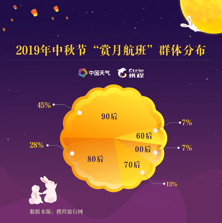 不仅如此,年龄结构上,90后是空中追月人数最多的群体,占比为45%;其次是80后,占比达28%;70后和00后分列第三、第四位,占比分别为13%、7%。中秋当晚(9月13日)、出发时间在18时至24时之间的航班通常被称作“赏月航班”,机上乘客在飞行途中能近距离“接触月亮”,感受“彩云追月”的新奇体验。