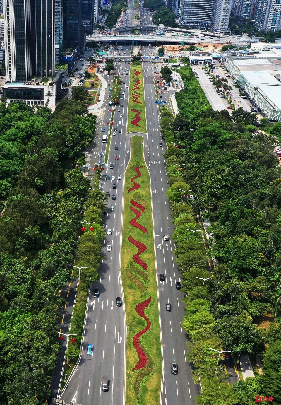 车辆行驶在深南大道上,沿路多处可以看到绿化工人们正在绿化带上忙碌着,种植鲜花,修剪草坪,浇水养护。深南大道东段中间带上,大红色的赤壁,搭配蓝色、粉色的大花香彩雀以及白里透粉的夏堇,共同组成了流线型的“凤凰飞羽”图案造型。从高处看去,绿化带与两侧路灯上悬挂的鲜艳的国旗交相辉映,浓浓的节日气息扑面而来。