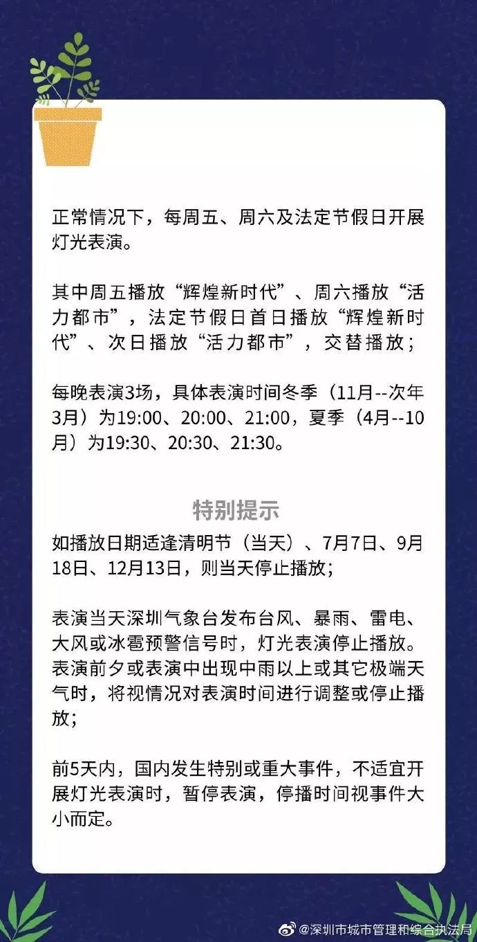 9月13日(星期五),因市民中心广场有项目施工,临时占用了灯光表演观看区域,为确保安全,当晚中心区灯光表演暂停。由此带来的不便,请市民和游客谅解!