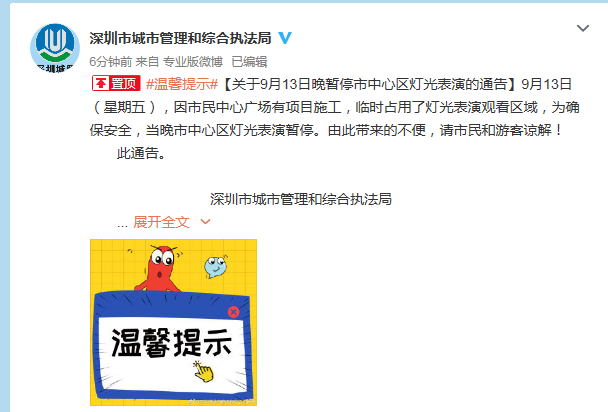 9月13日晚,也是就是中秋节当晚,中心区灯光表演暂停