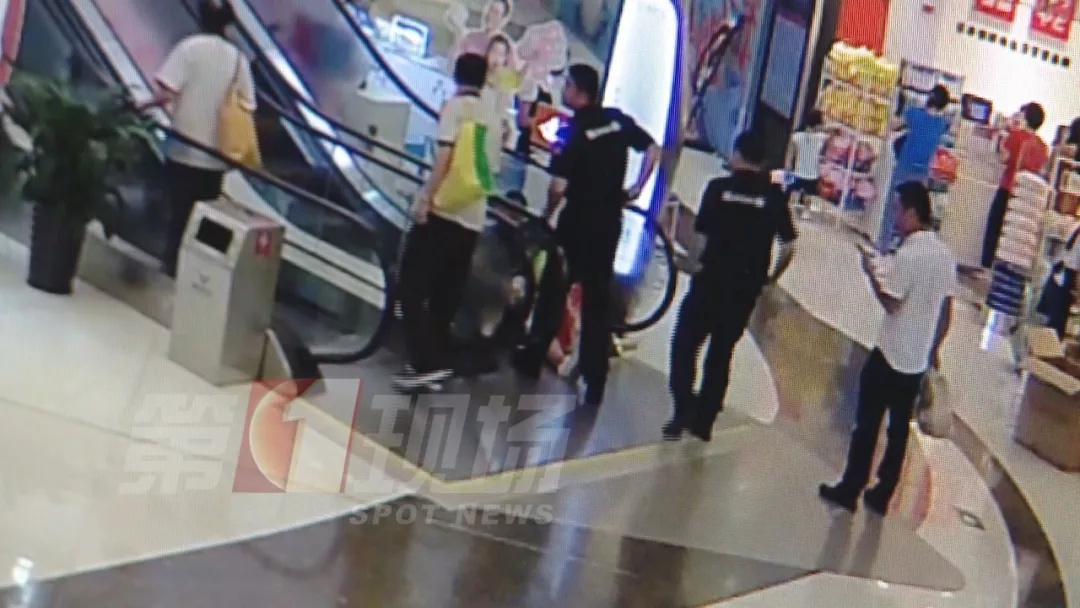 在商场的自动扶梯上,儿子的洞洞鞋被卷进了扶梯的空隙导致脚拔不出来。