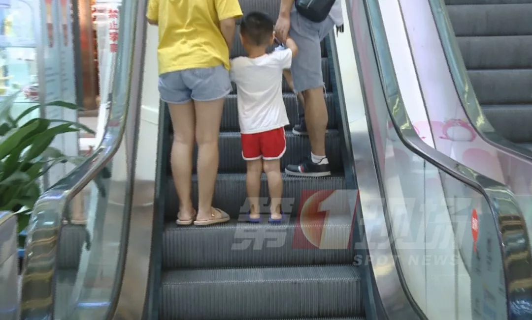 在商场的自动扶梯上,儿子的洞洞鞋被卷进了扶梯的空隙导致脚拔不出来。
