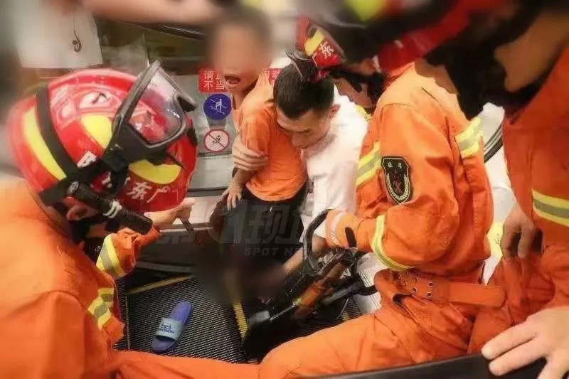 7月25日晚上,在南山区西丽留仙洞悦方广场商场1楼东部手扶梯,有个小男孩的脚就被卡在了扶手电梯里,情况危急。