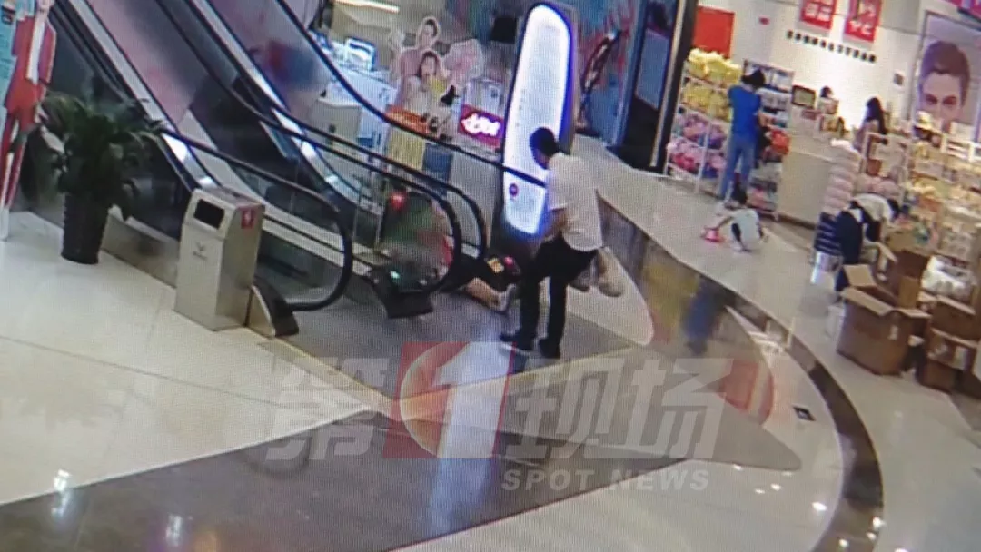 坪山嘉邻中心商场的监控显示:下午3点左右,李女士带着2岁多的儿子,从商场二楼下到一楼,在自动扶梯上,李女士突然蹲下来拉住了儿子的右腿,大声呼救。