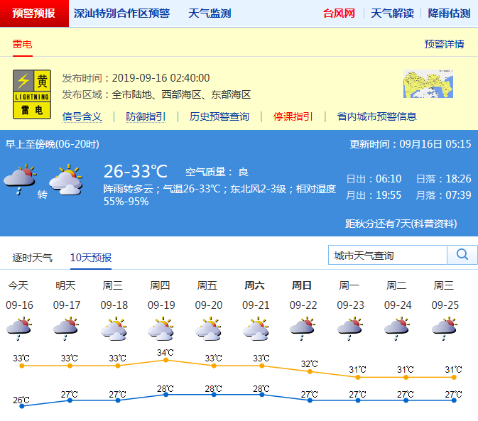见圳客户端·深圳新闻网2019年9月16日讯 深圳市气象台预计,周一我市多云,有短时(雷)阵雨,部分时间雨势稍大,气温26-33℃;周二至周日多云到晴天,天气趋于闷热,午后局地有短时阵雨。