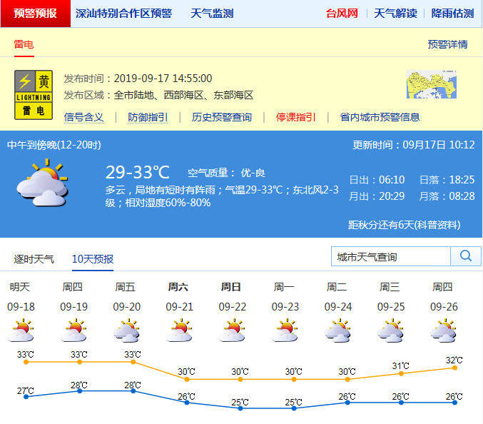 深圳市气象台于9月17日14时55分在全市发布雷电预警,预计60分钟内全市将受雷电影响,按照防御预案停止户外易燃易爆危险作业,并加强危化场所安全管理。