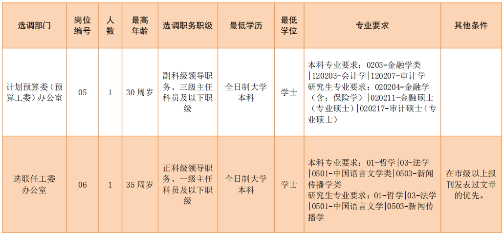 选调条件要求具有3年以上公务员工作经历(含试用期),已进行公务员登记,且历年公务员年度考核为称职及以上等次。全日制普通高校大学本科以上学历,学士以上学位。副科级领导职务、三级和四级主任科员、一级科员年龄在30周岁以下(1988年9月30日以后出生),正科级领导职务、一级和二级主任科员年龄在35周岁以下(1983年9月30日以后出生)等。