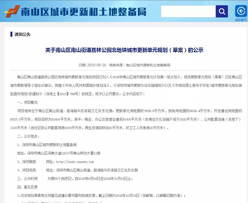 9月16日,南山区城市更新和土地整备局发布关于南山街道荔林公园北地块更新项目专规草案,并予以公示。
