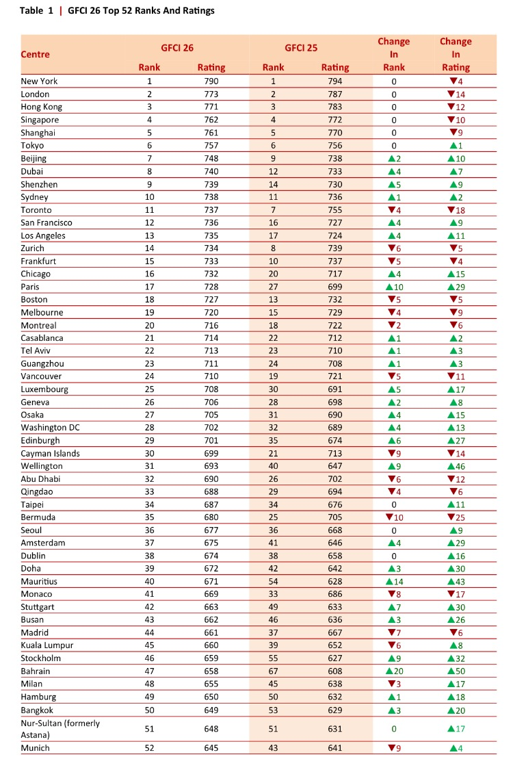 本期全球金融中心指数从营商环境、人力资源、基础设施、发展水平、国际声誉等方面对全球主要金融中心进行评价和排名,共有104个金融中心进入榜单。全球前十大金融中心排名依次为:纽约、伦敦、香港、新加坡、上海、东京、北京、迪拜、深圳、悉尼。