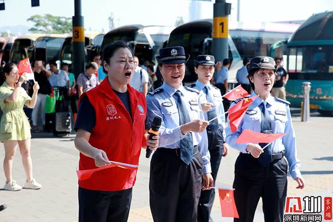 此时,一首熟悉的《我和我的祖国》在人群中突然响起,引得周边旅客纷纷驻足观望。原来,深圳湾边检站民警为庆祝新中国成立70周年精心准备的快闪节目此刻上演。随后《我爱你中国》、《红旗飘飘》依次唱响,现场的旅客逐渐围拢过来,有和着旋律挥动着国旗的,有拿起手机记录下这激动时刻的,现场变成一片红色的海洋。其中一位年近七旬的李大爷激动地说“听到这旋律、看到五星红旗心中就非常激动。我是一名老兵,我为我们的祖国感到骄傲自豪”,说话间,老人眼中泛起了泪花。快闪表演结束后,大批旅客还不愿离去,大家纷纷举起手机,拿起国旗,拍下此刻最美的自拍,向祖国献上最真挚的祝福:祝愿祖国明天更美好!