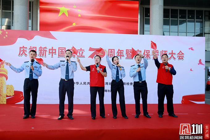 大会现场,一面巨幅国旗在12名边检民警的护卫下,在会场正中位置迎风拂动;国旗两侧,由深圳湾边检站民警、地方公安民警、驻地武警官兵、口岸辅警及口岸U站志愿者组成的方阵依次排列。