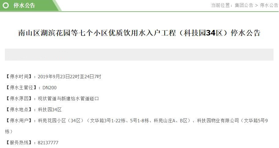 市民对停水公告有任何疑问,可以拨打水务集团服务热线:82137777。
