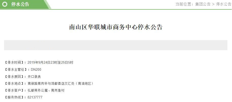 见圳客户端•深圳新闻网2019年9月22日讯 近日,深圳水务集团官网陆续发布停水公告。深圳新闻网记者了解到,9月23-24日,福田、南山、罗湖等区的多个小区和企业单位将受影响,请市民提前做好储水准备。