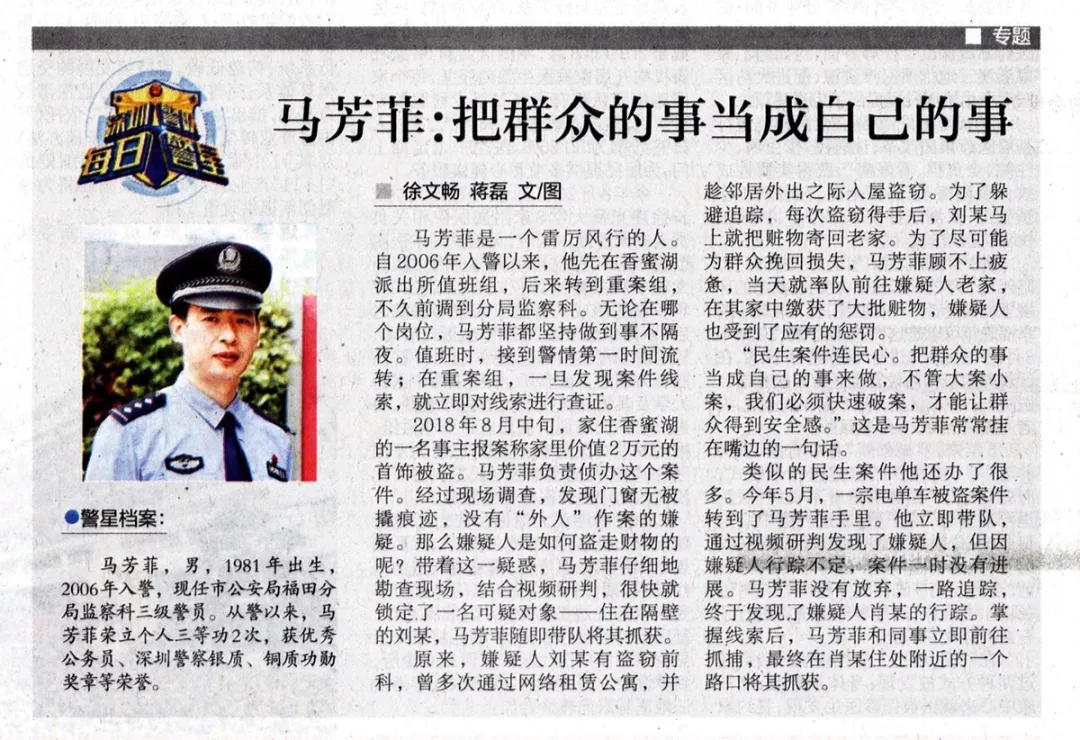 “民生案件连民心。把群众的事当成自己的事来做,不管大案小案,我们必须快速破案,才能让群众得到安全感。”这是马芳菲常常挂在嘴边的一句话。