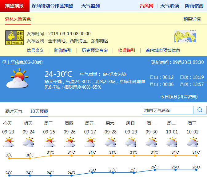 见圳客户端·深圳新闻网2019年9月23日讯 深圳市气象局今天晴天干燥;气温24-30℃;北风3级,阵风8级;相对湿度40%-65%。预计24-27日多云间晴天为主,湿度略有增加,部分时间有短时阵雨。