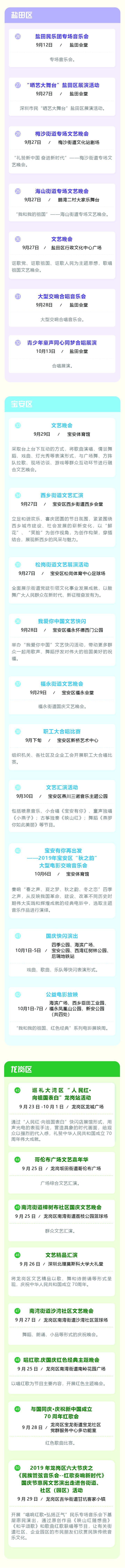 为庆祝中华人民共和国成立70周年,深圳市将举办专场音乐会、群众文艺晚会、焰火晚会等活动,同时将举行10场“爱我中华——南粤百园庆国庆”主题游园及80场“我和我的祖国”国庆群众文艺嘉年华活动。主题游园和文艺嘉年华活动安排如下: