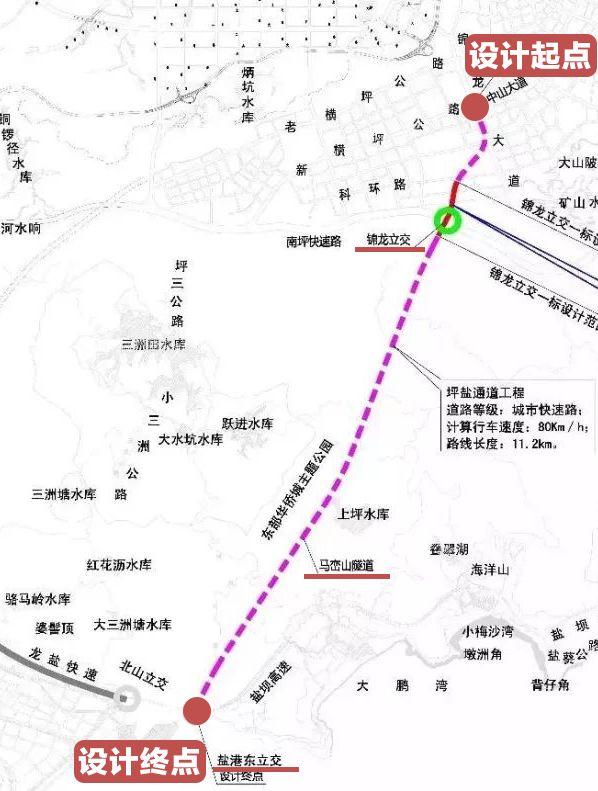 坪盐通道北起坪山区现状锦龙大道坪山大道路口,南至盐田区盐坝高速、盐港东立交,全长约11.252公里。