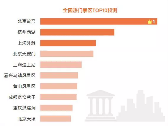 根据交通运输部科学研究院报告显示,国庆全国热门景区TOP10北京故宫、杭州西湖、上海外滩位列前三位,另外还有北京天安门、上海迪士尼、嘉兴乌镇风景区、黄山风景区、成都宽窄巷子、重庆洪崖洞、北京天坛位列其中。