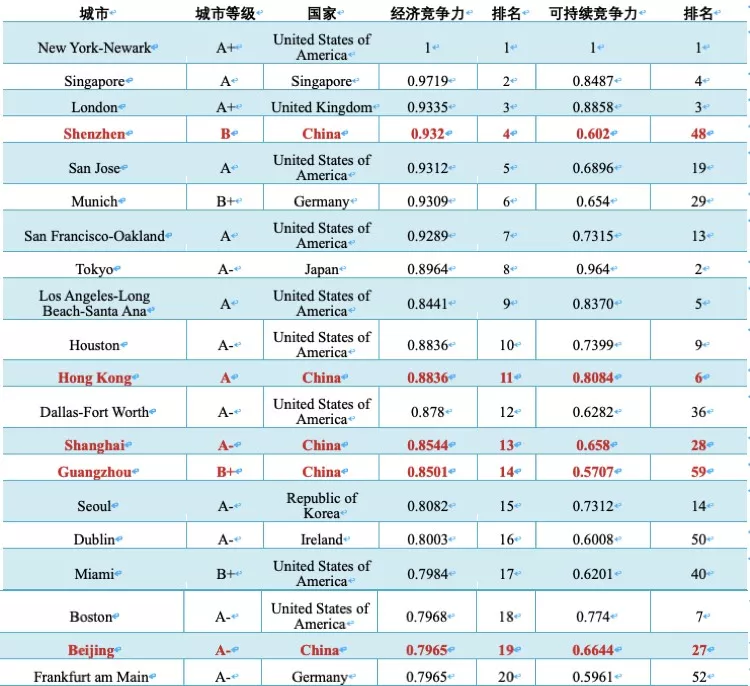 《报告》最重要的工作之一,就是通过对全球1007个城市的“经济竞争力”进行测度。而测度结果显示,2018年全球城市经济竞争力指数二十强:纽约、新加坡、伦敦、深圳、圣何塞、慕尼黑、旧金山、东京、洛杉矶、休斯顿、香港、达拉斯、上海、广州、首尔、都柏林、迈阿密、波士顿、北京和法兰克福。