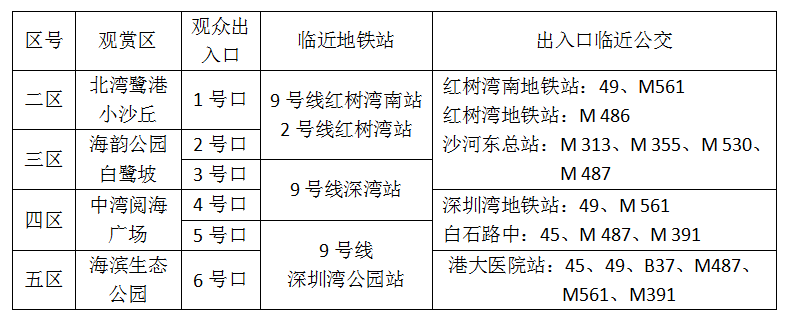 3.观赏区域。深圳湾公园南侧设二、三、四、五观赏区,具体区域见示意图: