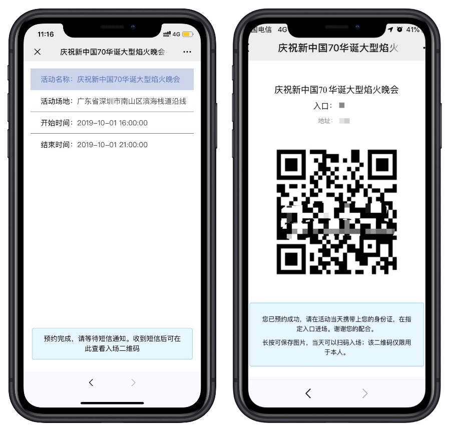 2.预约成功后将收到短信,预约页面将生成二维码,市民需凭此二维码及本人身份证入场,如下图所示: