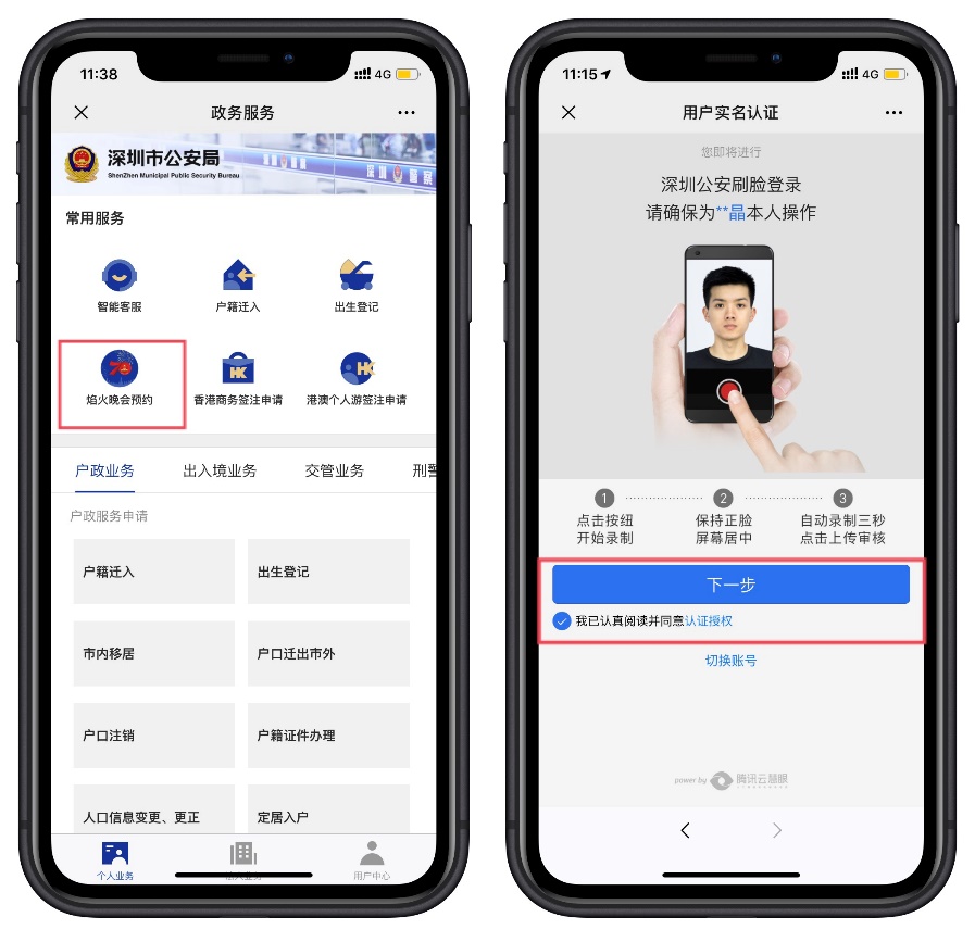 1.关注“深圳公安”微信公众号,选择“民生”栏,点击焰火晚会预约,通过人脸认证后即可进入预约页面,如下图所示: